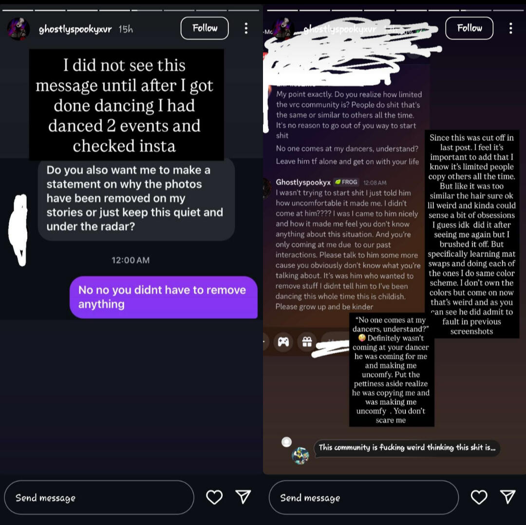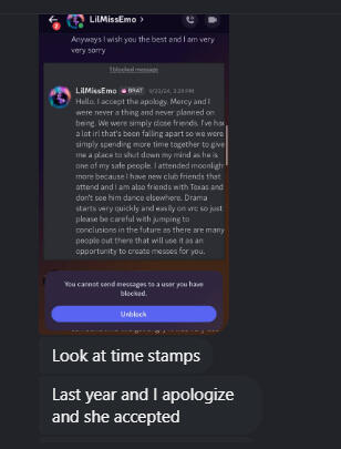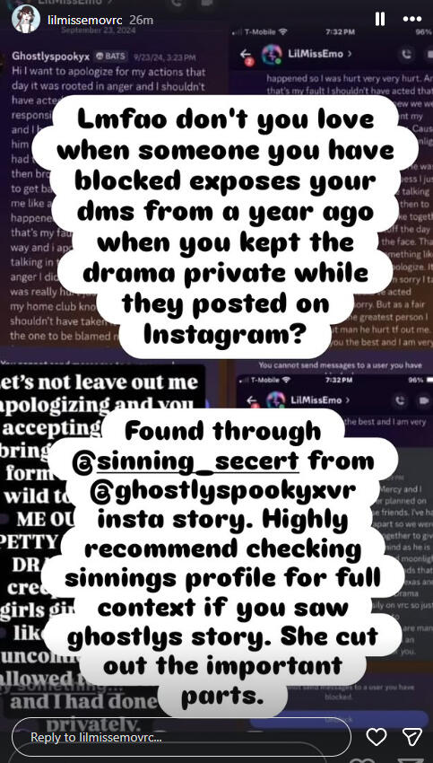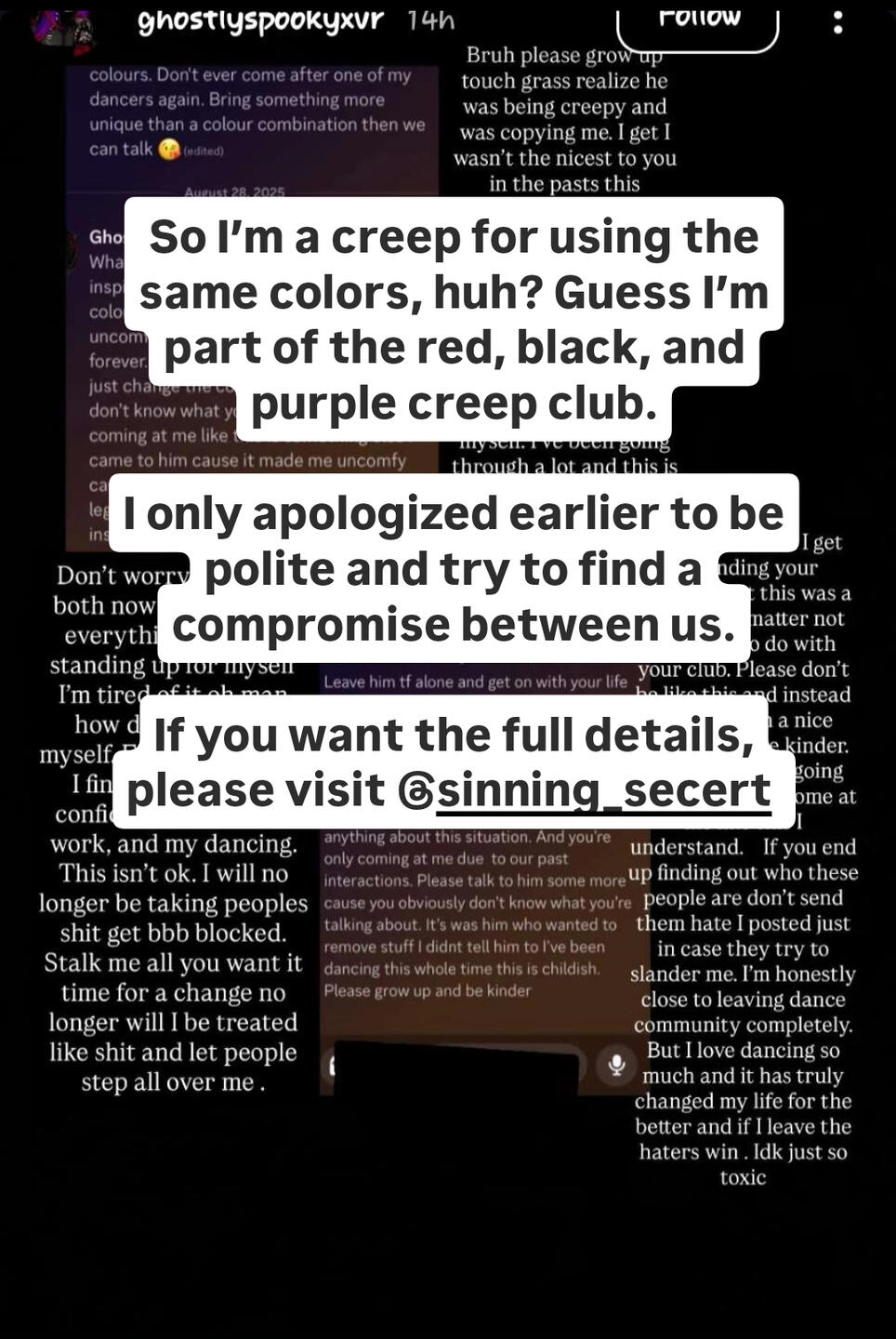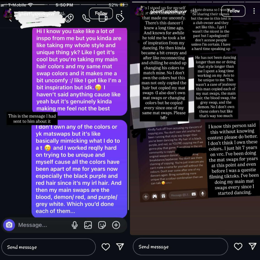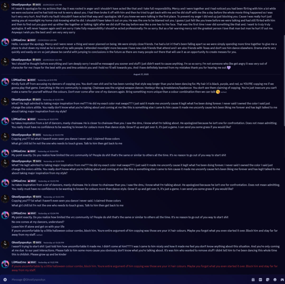 Ghostlyspookyx and LilMissEmo have a complicated history that has resulted in Ghostlyspookyx being demoted at Club MLH, an alleged death threat directed at LilMissEmo, and emotional distress for DarkDre. Recently, Ghostlyspookyx approached DarkDre regarding concerns that he was 'copying' her avatar colors and mat swaps. Both DarkDre and LilMissEmo interpreted her reaction as being related to color choices, as her combinations and swaps are commonly used within VRChat. Following my previous post, Ghostlyspookyx indicated that her concerns stemmed from feelings about DarkDre's behavior. Currently, I have not found evidence to substantiate these claims, but it is important to note that a lack of evidence does not imply innocence. I will provide updates if any new information emerges.The focus has now shifted, as Ghostlyspookyx has blocked both DarkDre and LilMissEmo but continues to mention LilMissEmo in her posts, including sharing cropped screenshots that reveal her name.Additionally, there is a claim made by Ghostlyspookyx that requires clarification. In the August 2024 screenshots, she states, "Mercy and I were together" and "we were exclusive." However, this assertion can be contradicted by the fact that Mercy was in a relationship with someone outside of VRChat during this time. It was also known among his friends that their relationship could be characterized as casual. It is important to address whether Ghostlyspookyx was misled or intentionally misrepresenting the situation.