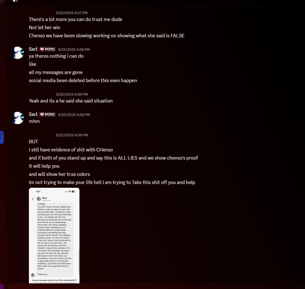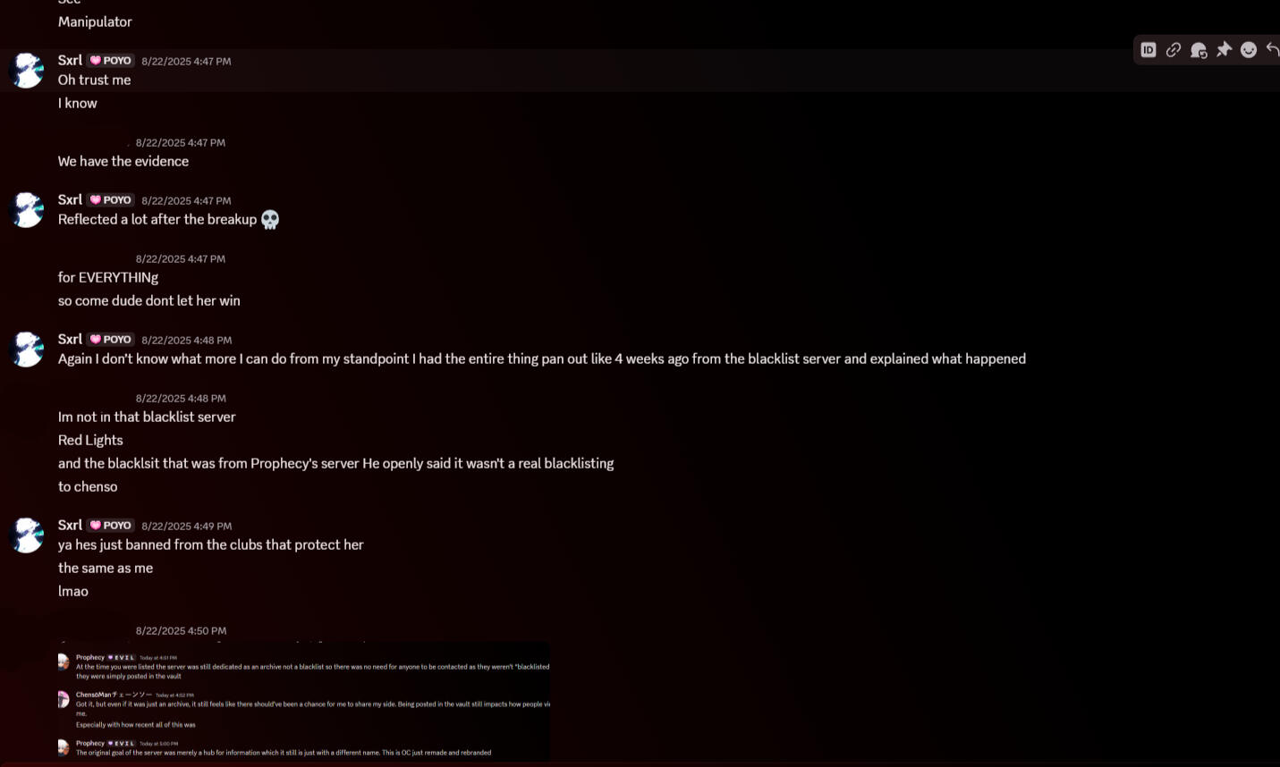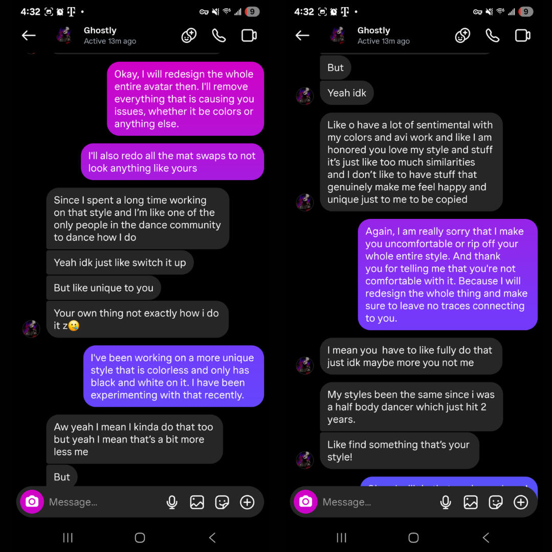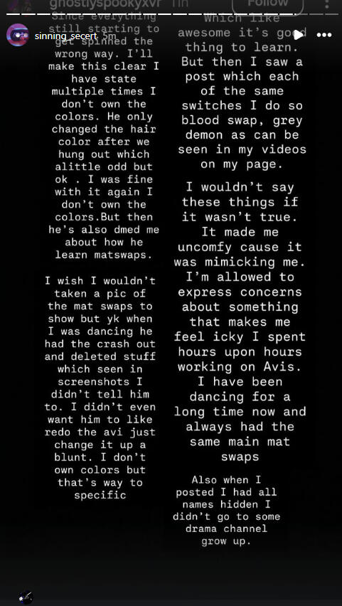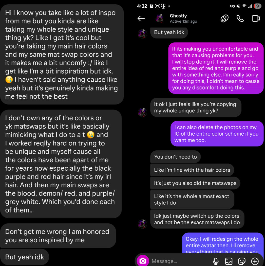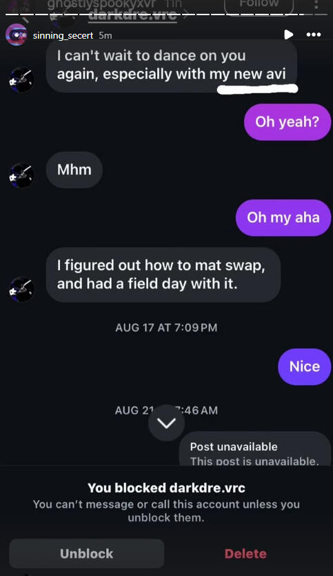 Ghostlyspookyx and LilMissEmo have a complicated history that has resulted in Ghostlyspookyx being demoted at Club MLH, an alleged death threat directed at LilMissEmo, and emotional distress for DarkDre. Recently, Ghostlyspookyx approached DarkDre regarding concerns that he was 'copying' her avatar colors and mat swaps. Both DarkDre and LilMissEmo interpreted her reaction as being related to color choices, as her combinations and swaps are commonly used within VRChat. Following my previous post, Ghostlyspookyx indicated that her concerns stemmed from feelings about DarkDre's behavior. Currently, I have not found evidence to substantiate these claims, but it is important to note that a lack of evidence does not imply innocence. I will provide updates if any new information emerges.The focus has now shifted, as Ghostlyspookyx has blocked both DarkDre and LilMissEmo but continues to mention LilMissEmo in her posts, including sharing cropped screenshots that reveal her name.Additionally, there is a claim made by Ghostlyspookyx that requires clarification. In the August 2024 screenshots, she states, "Mercy and I were together" and "we were exclusive." However, this assertion can be contradicted by the fact that Mercy was in a relationship with someone outside of VRChat during this time. It was also known among his friends that their relationship could be characterized as casual. It is important to address whether Ghostlyspookyx was misled or intentionally misrepresenting the situation.