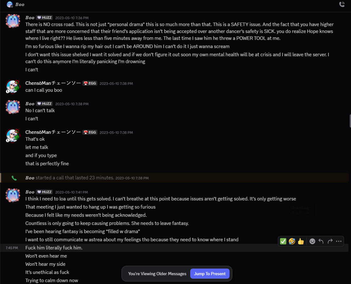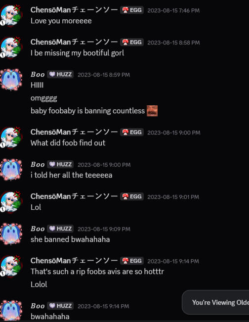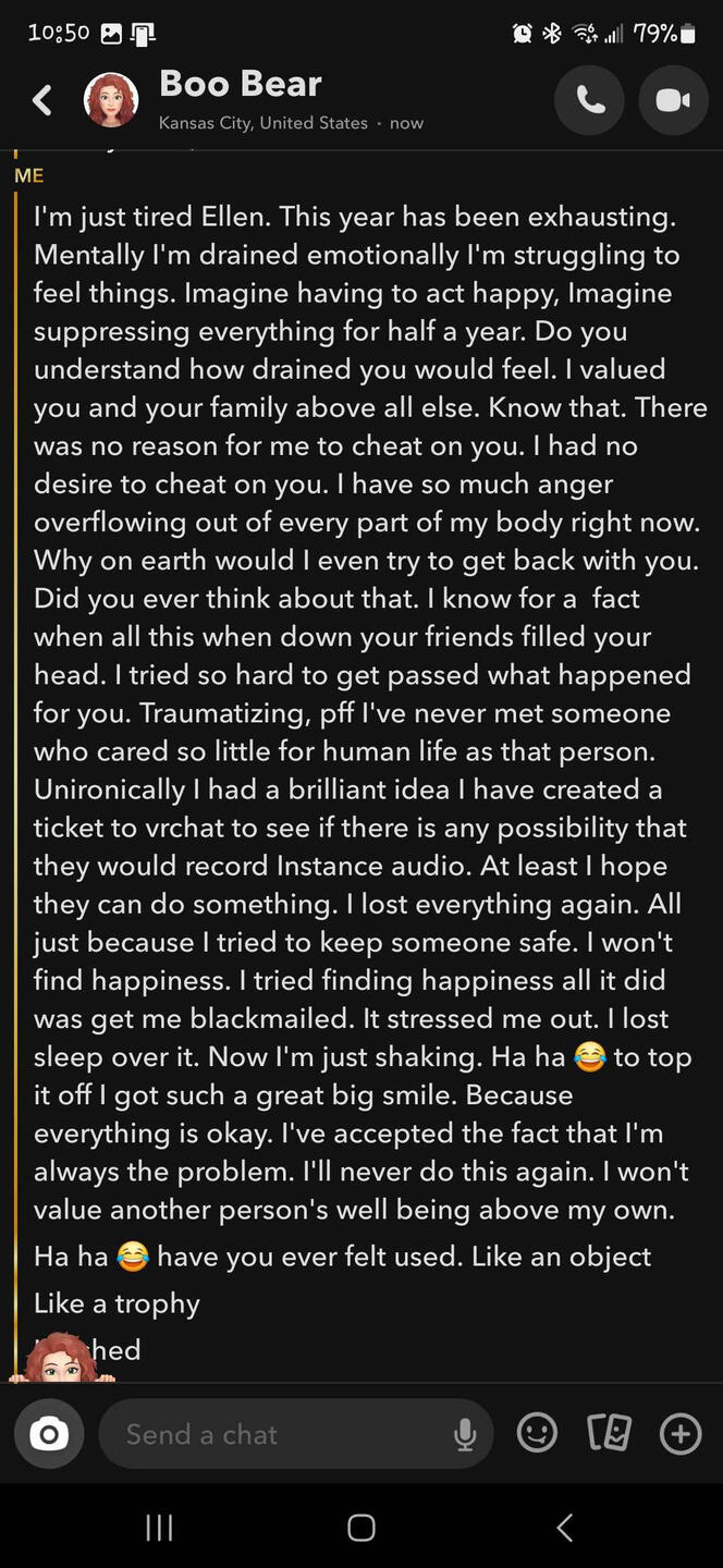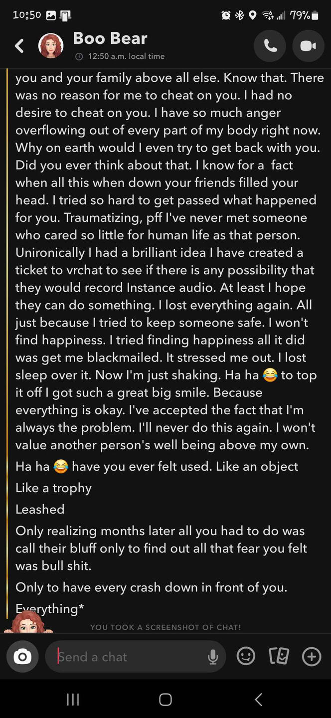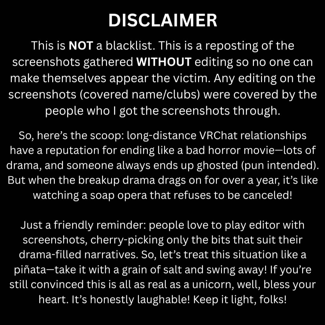 There appears to be a consistent pattern in Boo's three relationships within the VRC community, where the men involved have faced significant consequences, including being blacklisted.The attached pictures and videos aim to illustrate a pattern and offer additional context to these situations. While it remains unclear whether this reflects on Boo's judgment or the dynamics at play, the materials may offer insights that could help in understanding. It is important to note that the interpretation of these events is subjective and open to discussion.